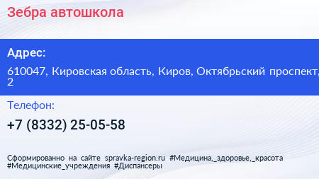 Зебра, автошкола по адресу 610047, Кировская область, Киров, Октябрьский проспект, 2 в дальнейшем Организация, размещена в следующих категориях: