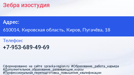 Зебра, изостудия по адресу 610014, Кировская область, Киров, Пугачёва, 18 в дальнейшем Организация, размещена в следующих категориях: