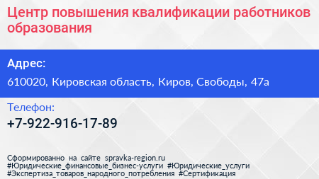 Центр повышения квалификации работников образования по адресу 610020, Кировская область, Киров, Свободы, 47а в дальнейшем Организация, размещена в следующих категориях: