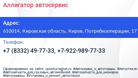 Аллигатор, автосервис по адресу 610014, Кировская область, Киров, Потребкооперации, 17 в дальнейшем Организация, размещена в следующих категориях: