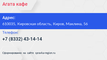 Агата, кафе по адресу 610035, Кировская область, Киров, Маклина, 56 в дальнейшем Организация, размещена в следующих категориях: