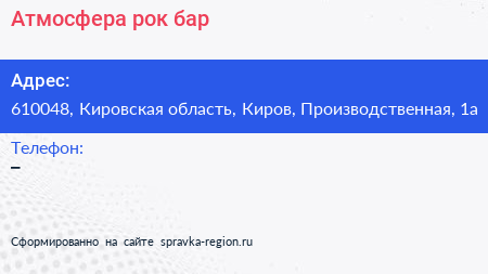 Атмосфера, рок-бар по адресу 610048, Кировская область, Киров, Производственная, 1а в дальнейшем Организация, размещена в следующих категориях: