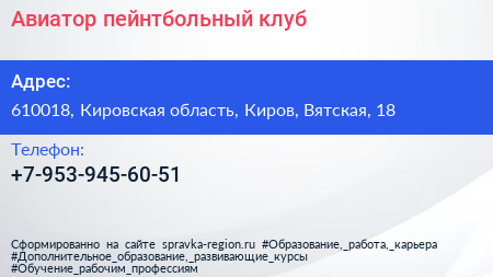 Авиатор, пейнтбольный клуб по адресу 610018, Кировская область, Киров, Вятская, 18 в дальнейшем Организация, размещена в следующих категориях: