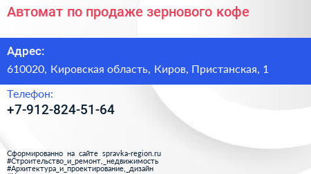 Автомат по продаже зернового кофе по адресу 610020, Кировская область, Киров, Пристанская, 1 в дальнейшем Организация, размещена в следующих категориях: