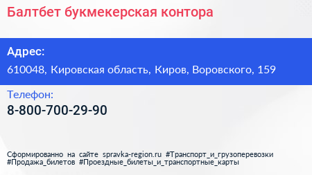 Балтбет, букмекерская контора по адресу 610048, Кировская область, Киров, Воровского, 159 в дальнейшем Организация, размещена в следующих категориях: