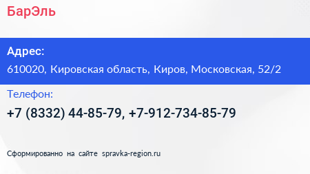 БарЭль по адресу 610020, Кировская область, Киров, Московская, 52/2 в дальнейшем Организация, размещена в следующих категориях: