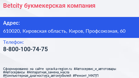Betcity, букмекерская компания по адресу 610020, Кировская область, Киров, Профсоюзная, 60 в дальнейшем Организация, размещена в следующих категориях: