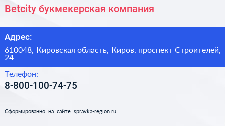Betcity, букмекерская компания по адресу 610048, Кировская область, Киров, проспект Строителей, 24 в дальнейшем Организация, размещена в следующих категориях: