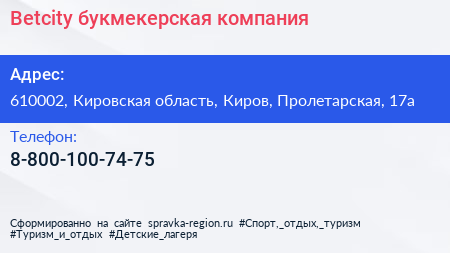 Betcity, букмекерская компания по адресу 610002, Кировская область, Киров, Пролетарская, 17а в дальнейшем Организация, размещена в следующих категориях: