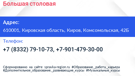 Большая столовая по адресу 610001, Кировская область, Киров, Комсомольская, 42Б в дальнейшем Организация, размещена в следующих категориях: