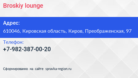 Broskiy lounge по адресу 610046, Кировская область, Киров, Преображенская, 97 в дальнейшем Организация, размещена в следующих категориях: