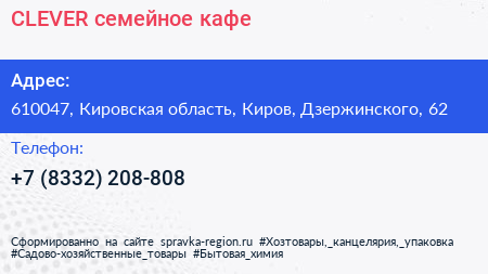 CLEVER, семейное кафе по адресу 610047, Кировская область, Киров, Дзержинского, 62 в дальнейшем Организация, размещена в следующих категориях: