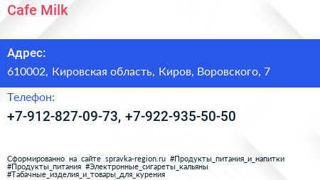 Cafe Мilk по адресу 610002, Кировская область, Киров, Воровского, 7 в дальнейшем Организация, размещена в следующих категориях: