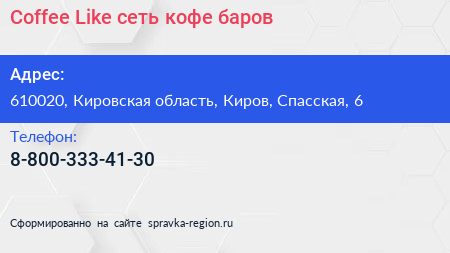 Coffee Like, сеть кофе-баров по адресу 610020, Кировская область, Киров, Спасская, 6 в дальнейшем Организация, размещена в следующих категориях: