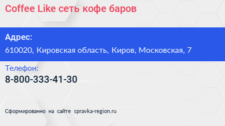 Coffee Like, сеть кофе-баров по адресу 610020, Кировская область, Киров, Московская, 7 в дальнейшем Организация, размещена в следующих категориях:
