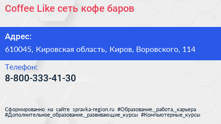 Coffee Like, сеть кофе-баров по адресу 610045, Кировская область, Киров, Воровского, 114 в дальнейшем Организация, размещена в следующих категориях: