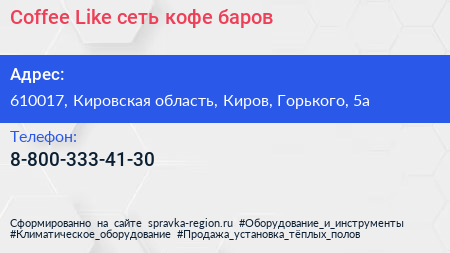 Coffee Like, сеть кофе-баров по адресу 610017, Кировская область, Киров, Горького, 5а в дальнейшем Организация, размещена в следующих категориях: