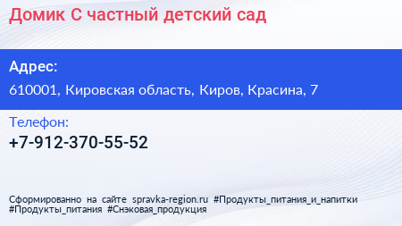 Домик С, частный детский сад по адресу 610001, Кировская область, Киров, Красина, 7 в дальнейшем Организация, размещена в следующих категориях: