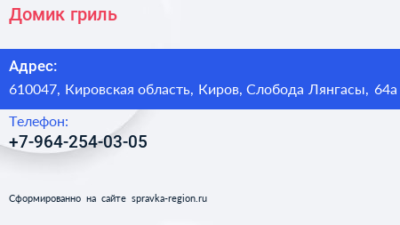 Домик-гриль по адресу 610047, Кировская область, Киров, Слобода Лянгасы, 64а в дальнейшем Организация, размещена в следующих категориях: