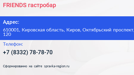 FRIENDS, гастробар по адресу 610001, Кировская область, Киров, Октябрьский проспект, 120 в дальнейшем Организация, размещена в следующих категориях: