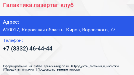 Галактика, лазертаг-клуб по адресу 610017, Кировская область, Киров, Воровского, 77 в дальнейшем Организация, размещена в следующих категориях: