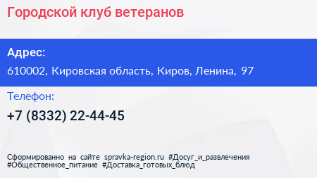 Городской клуб ветеранов по адресу 610002, Кировская область, Киров, Ленина, 97 в дальнейшем Организация, размещена в следующих категориях: