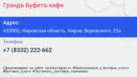 Грандъ Буфетъ, кафе по адресу 610002, Кировская область, Киров, Воровского, 21а в дальнейшем Организация, размещена в следующих категориях: