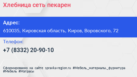Хлебница, сеть пекарен по адресу 610035, Кировская область, Киров, Воровского, 72 в дальнейшем Организация, размещена в следующих категориях: