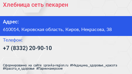Хлебница, сеть пекарен по адресу 610014, Кировская область, Киров, Некрасова, 38 в дальнейшем Организация, размещена в следующих категориях: