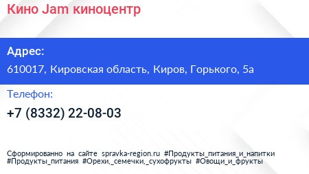 Кино Jam, киноцентр по адресу 610017, Кировская область, Киров, Горького, 5а в дальнейшем Организация, размещена в следующих категориях: