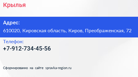 Крылья по адресу 610020, Кировская область, Киров, Преображенская, 72 в дальнейшем Организация, размещена в следующих категориях: