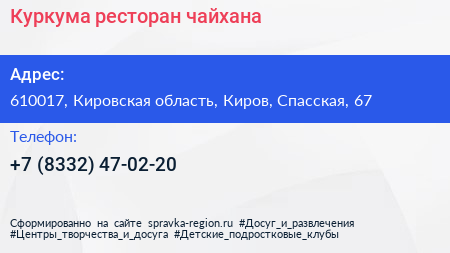 Куркума, ресторан-чайхана по адресу 610017, Кировская область, Киров, Спасская, 67 в дальнейшем Организация, размещена в следующих категориях: