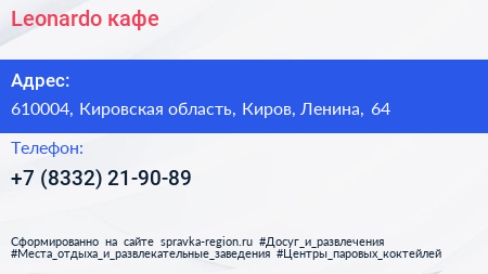 Leonardo, кафе по адресу 610004, Кировская область, Киров, Ленина, 64 в дальнейшем Организация, размещена в следующих категориях: