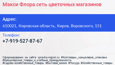 Макси Флора, сеть цветочных магазинов по адресу 610021, Кировская область, Киров, Воровского, 151 в дальнейшем Организация, размещена в следующих категориях: