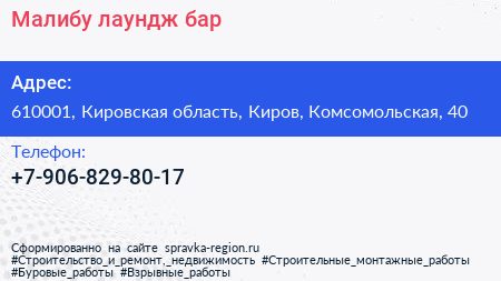 Малибу, лаундж-бар по адресу 610001, Кировская область, Киров, Комсомольская, 40 в дальнейшем Организация, размещена в следующих категориях: