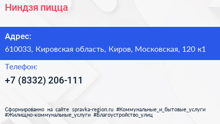 Ниндзя-пицца по адресу 610033, Кировская область, Киров, Московская, 120 к1 в дальнейшем Организация, размещена в следующих категориях: