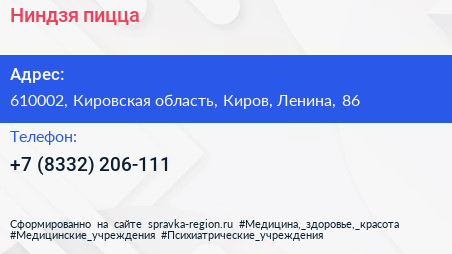 Ниндзя-пицца по адресу 610002, Кировская область, Киров, Ленина, 86 в дальнейшем Организация, размещена в следующих категориях: