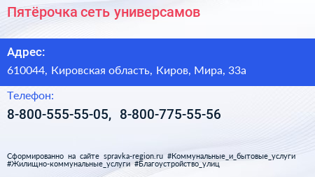 Пятёрочка, сеть универсамов по адресу 610044, Кировская область, Киров, Мира, 33а в дальнейшем Организация, размещена в следующих категориях: