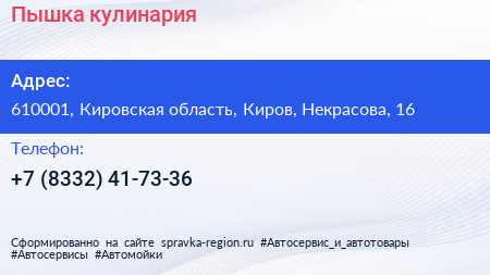 Пышка, кулинария по адресу 610001, Кировская область, Киров, Некрасова, 16 в дальнейшем Организация, размещена в следующих категориях: