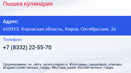 Пышка, кулинария по адресу 610913, Кировская область, Киров, Октябрьская, 2а в дальнейшем Организация, размещена в следующих категориях: