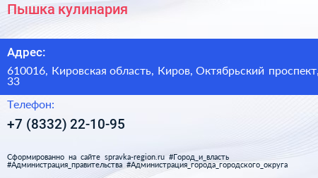 Пышка, кулинария по адресу 610016, Кировская область, Киров, Октябрьский проспект, 33 в дальнейшем Организация, размещена в следующих категориях: