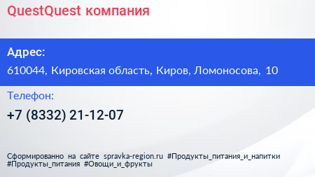 QuestQuest, компания по адресу 610044, Кировская область, Киров, Ломоносова, 10 в дальнейшем Организация, размещена в следующих категориях: