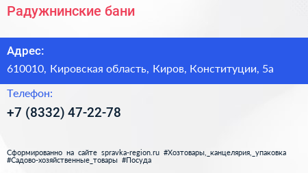 Радужнинские бани по адресу 610010, Кировская область, Киров, Конституции, 5а в дальнейшем Организация, размещена в следующих категориях: