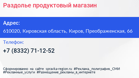 Раздолье, продуктовый магазин по адресу 610020, Кировская область, Киров, Преображенская, 66 в дальнейшем Организация, размещена в следующих категориях: