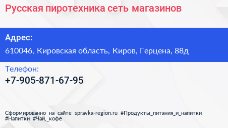 Русская пиротехника, сеть магазинов по адресу 610046, Кировская область, Киров, Герцена, 88д в дальнейшем Организация, размещена в следующих категориях: