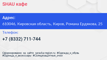 SHAU, кафе по адресу 610046, Кировская область, Киров, Романа Ердякова, 25 в дальнейшем Организация, размещена в следующих категориях: