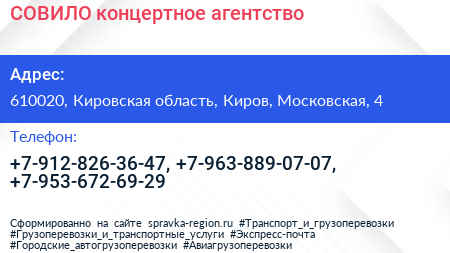 СОВИЛО, концертное агентство по адресу 610020, Кировская область, Киров, Московская, 4 в дальнейшем Организация, размещена в следующих категориях:
