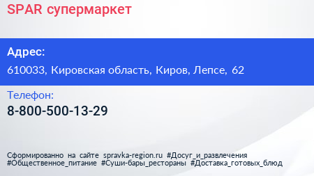 SPAR, супермаркет по адресу 610033, Кировская область, Киров, Лепсе, 62 в дальнейшем Организация, размещена в следующих категориях: