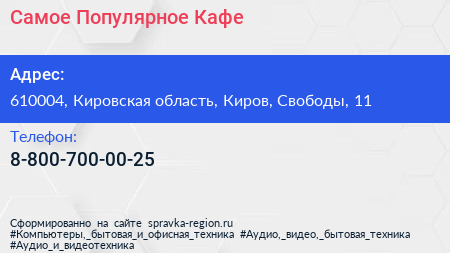 Самое Популярное Кафе по адресу 610004, Кировская область, Киров, Свободы, 11 в дальнейшем Организация, размещена в следующих категориях: