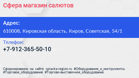 Сфера, магазин салютов по адресу 610008, Кировская область, Киров, Советская, 54/1 в дальнейшем Организация, размещена в следующих категориях: